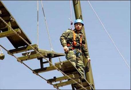 拓展訓練項目操作:1、操作者系好安全帶,攀至蹺板橋的一端,掛好保護鎖。