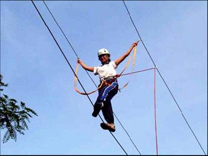 拓展訓(xùn)練項(xiàng)目操作:1、腳踩下面的鋼索,雙手分別抓住上方兩根鋼索。
