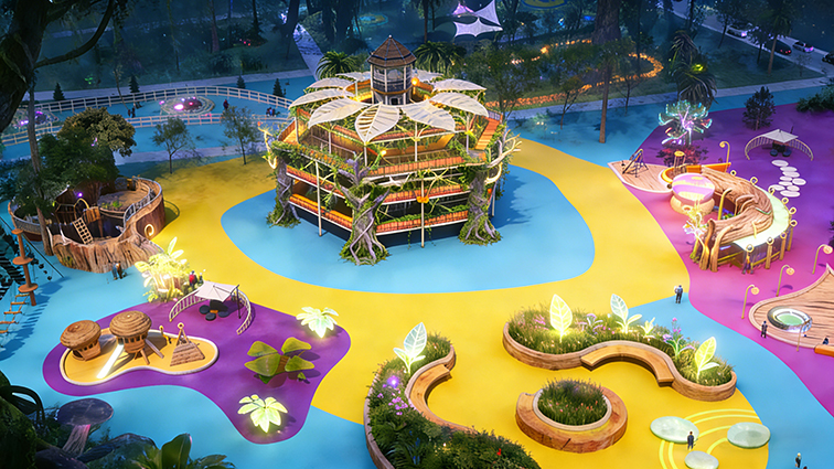 核心樹屋采用仿生藤蔓與木質(zhì)結(jié)構(gòu),搭配巨型葉片遮陽頂,營造出童話般的視覺效果。