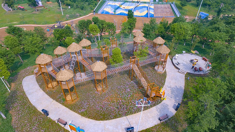 設計亮點:創(chuàng)新環(huán)形布局實現無死角游覽與雙向闖關,高密度繩網與模塊化平臺兼顧通透性與安全性;茅草頂造型極具辨識度,與戶外自然環(huán)境完美融合,打造網紅打卡地標。