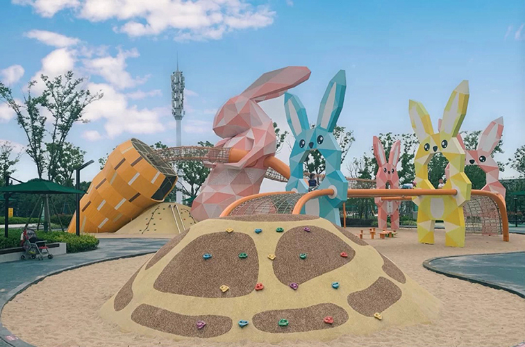 “幾何兔島・萌趣探險樂園” 是專為城市公園、親子景區(qū)打造的低多邊形動物主題拓展設備。以多只色彩明快的幾何兔子為核心造型,將攀爬網(wǎng)、鉆筒通道、滑梯與沙坑攀巖區(qū)巧妙融合,營造出充滿童趣的 “兔子農(nóng)場” 場景。