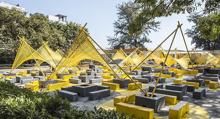 這是一款兼具休憩與互動(dòng)功能的公共藝術(shù)景觀裝置,以黃色張拉膜結(jié)構(gòu)為視覺核心,搭配黃灰撞色的幾何模塊化座椅,整體造型如散落于戶外的金芒織陣,視覺上充滿現(xiàn)代藝術(shù)感與活力。