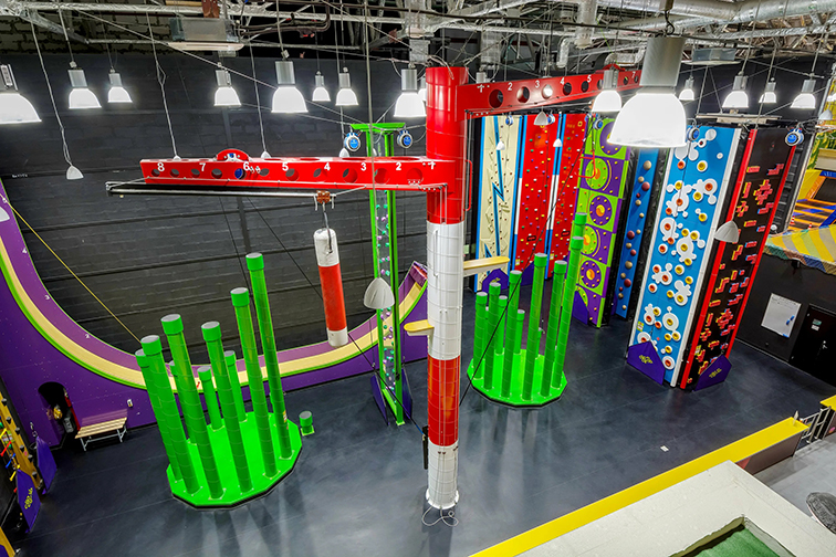 這是一款集攀巖、高空穿越、彈跳挑戰(zhàn)于一體的大型室內(nèi)競技游樂設(shè)備,以高飽和的紅、綠、紫、藍撞色設(shè)計為視覺核心,融合了多風格攀巖墻、懸掛式橫桿區(qū)、綠色梅花樁與弧形坡道等多元關(guān)卡,整體如一座充滿賽博感的色彩試煉場,兼具硬核挑戰(zhàn)與潮流打卡屬性。