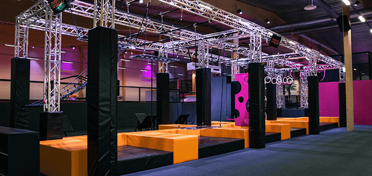 這是一款專為追求刺激與競技感的年輕客群打造的室內(nèi)闖關(guān)游樂設(shè)備,以工業(yè)風鋼架結(jié)構(gòu)為骨架,融合吊環(huán)、懸掛平臺、繩網(wǎng)攀爬、奶酪墻等經(jīng)典忍者勇士關(guān)卡模塊,搭配黑、橙、粉的撞色設(shè)計與霓虹燈光,整體如一座充滿動感的極限挑戰(zhàn)場,兼具硬核質(zhì)感與潮流氛圍。
